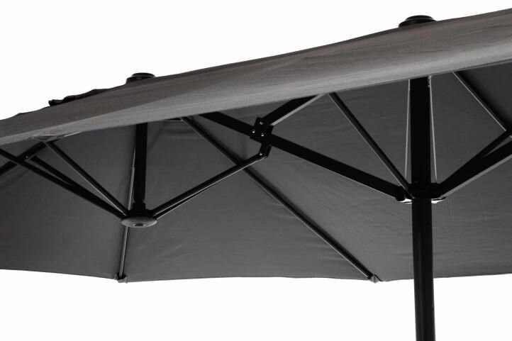 Obrovský slunečník pro vaši zahradu, balkon, bazén a terasu. Zahradní slunečník má praktický oválný tvar. Ideální velikost 450 x 265 cm poskytuje dostatek stínu pro požadované místo. Slunečník se skládá ze 2 střech se stínem, které umožňují větší stín pro větší prostor k sezení než běžný slunečník. Je dobrou alternativou k jakékoli markýze. Jednoduchá nekomplikovaná montáž a demontáž. Jednoduše umístěte do příslušného stojanu na slunečník a vytáhnete slunečník. Žádné šrouby, žádné hmoždinky. Konstrukce slunečníku je rovnoměrně tažená dvanácti příčlemi, které dávají odolné polyesterové tkanině potřebné napětí.