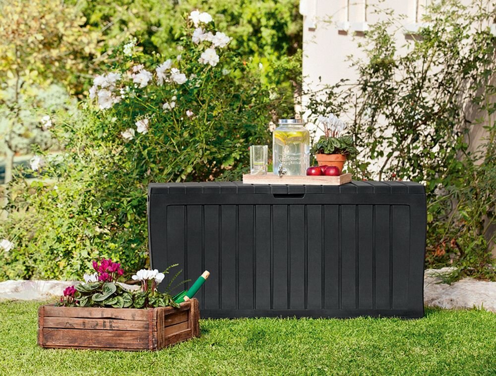 Plastový box pro uložení nejrůznějších předmětů (podušky, zahradní náčiní) od firmy KETER. Výhodou tohoto boxu je jednoduchá montáž (bez využití nářadí - vše složíte jak stavebnici), vysoká kvalita boxu a moderní design. Materiál má UV ochranu a je odolný nepřízni počasí. Udrží až 220 kg a tak ho můžete využít také jako lavičku.