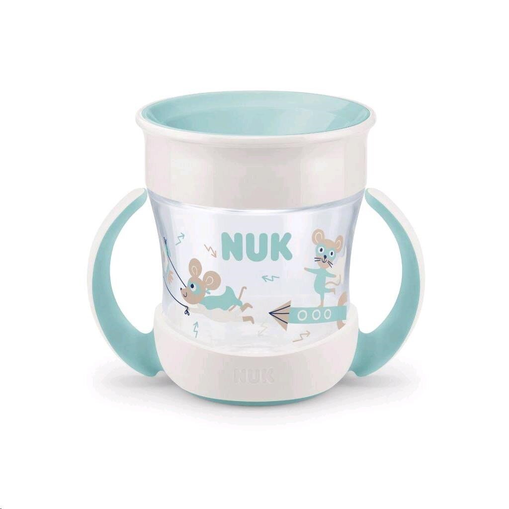 Dětský hrníček MIni Magic NUK 360° s víčkem. Revoluční uzávěr umožňuje pít bez náustku či brčka z každé strany, díky čemuž se dítě učí samo pít jako z normálního hrníčku. Neobsahuje BPA.