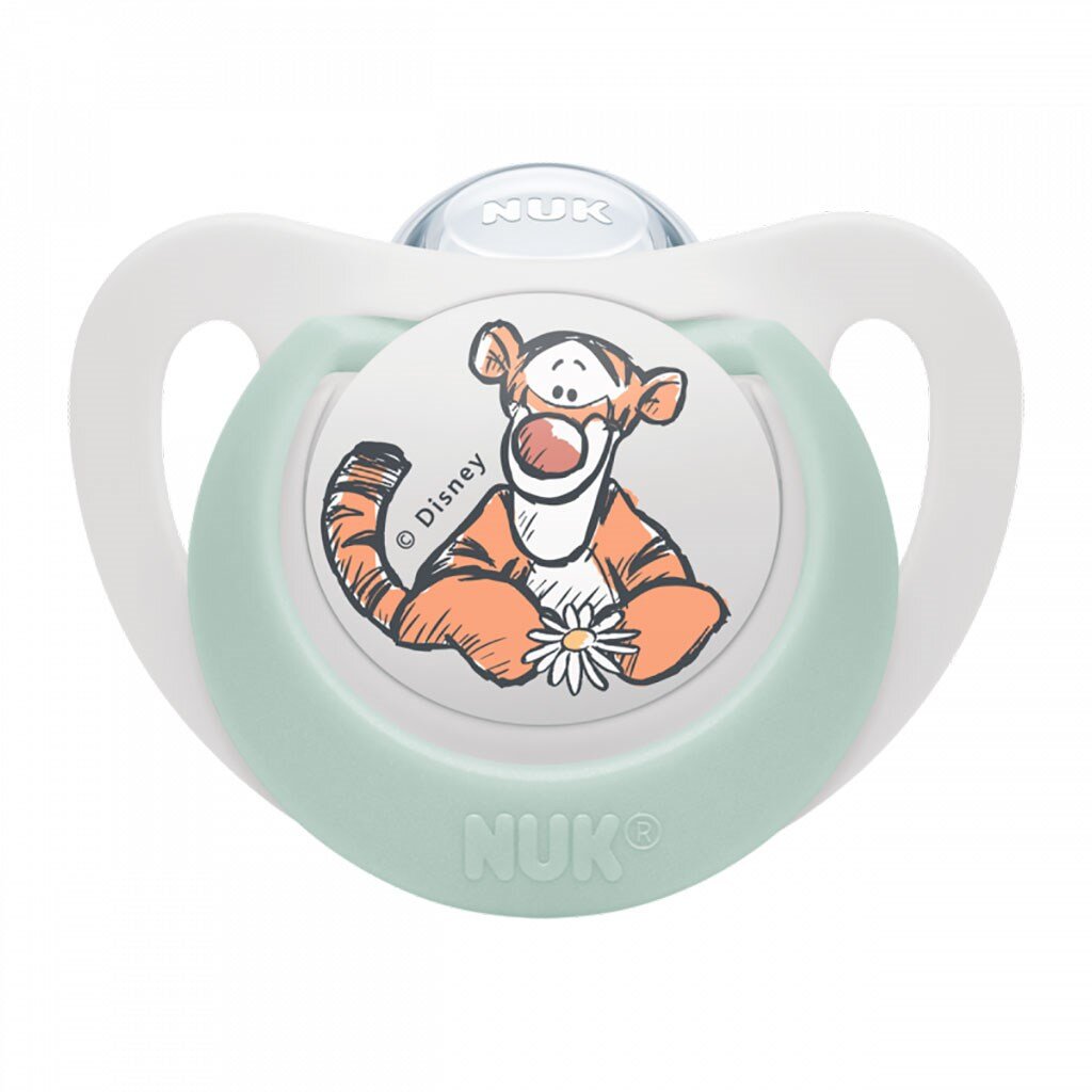 Kojenecký dudlík Star NUK 6-18 měsíců. Dudlík má krásný obrázek s motivem Disney. Ortodontický tvar podporuje vývoj celé ústní dutiny dítěte. Dudlík je vyroben z vysoce kvalitního plastu a silikonového dudlíku. Výhodou silikonu je to, že je bez zápachu a lehce se čistí. Neobsahuje BPA. Dudlík je dodáván v plastovém boxu, který slouží jako kryt před ušpiněním a je vhodný i na sterilizování v mikrovlnce. Všechny NUK dudlíky jsou pravidelně testovány a sledovány nezávislými instituty. Vhodný pro správný vývoj čelisti, a zvláště šetrný při kojení, snadné střídání kojení a tišení dudlíkem . Extra měkký - jemně se přitlačí na patro díky speciální měkké zóně na horní straně dudlíku.